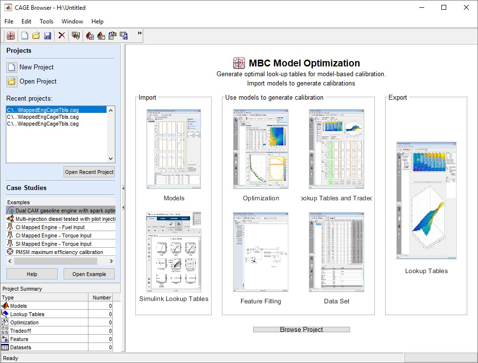 Начните при помощи кнопок на правой панели для общих калибровочных задач: импортируйте модели; настройте оптимизацию, интерполяционные таблицы, покажите стратегии или наборы данных; или экспортируйте интерполяционные таблицы.