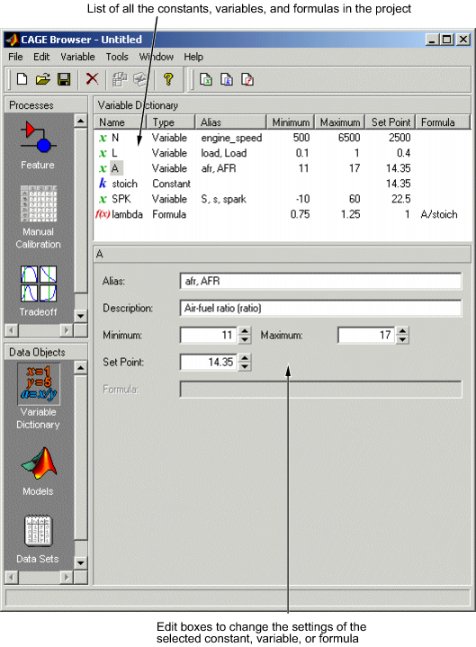 Выбор представления Variable Dictionary отображает переменные, константы и формулы в текущем проекте.