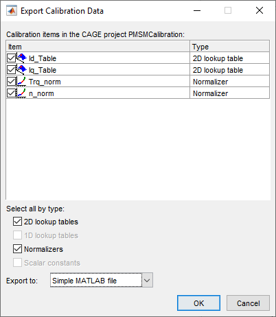 Использование Экспортирует Калибровочные Данные, чтобы выбрать элементы, чтобы экспортировать и отформатировать. Например, экспортируйте таблицы Id и Iq и точки останова к файлу MATLAB gs_example.m.