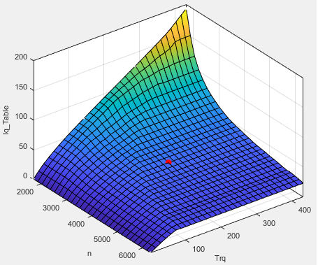 текущая q-ось, Iq, как функция моторного крутящего момента, Trq, и частота вращения двигателя, n.