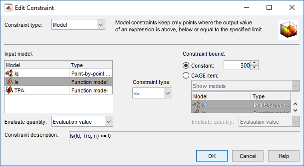 Добавьте ограничение оптимизации для текущей величины, Is. В Браузере CAGE выберите Optimization> Constraints> Add Constraints, чтобы открыть Ограничение Редактирования. Используйте диалоговое окно, чтобы создать ограничение на ток.
