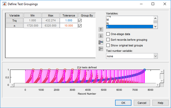 В Редакторе Данных выберите Tools> Test Groups, чтобы открыть диалоговое окно Define Test Groupings. Создайте группы для моторного крутящего момента и скорости.