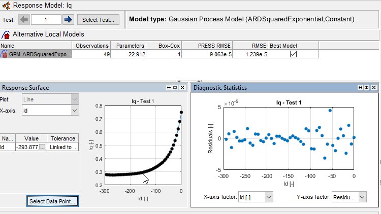 В Model Browser выберите Iq. Исследуйте поверхность ответа и диагностическую статистику. Эти результаты показывают на довольно точную подгонку. Можно просмотреть каждый тест, чтобы исследовать ответ на каждую рабочую точку скорости крутящего момента.