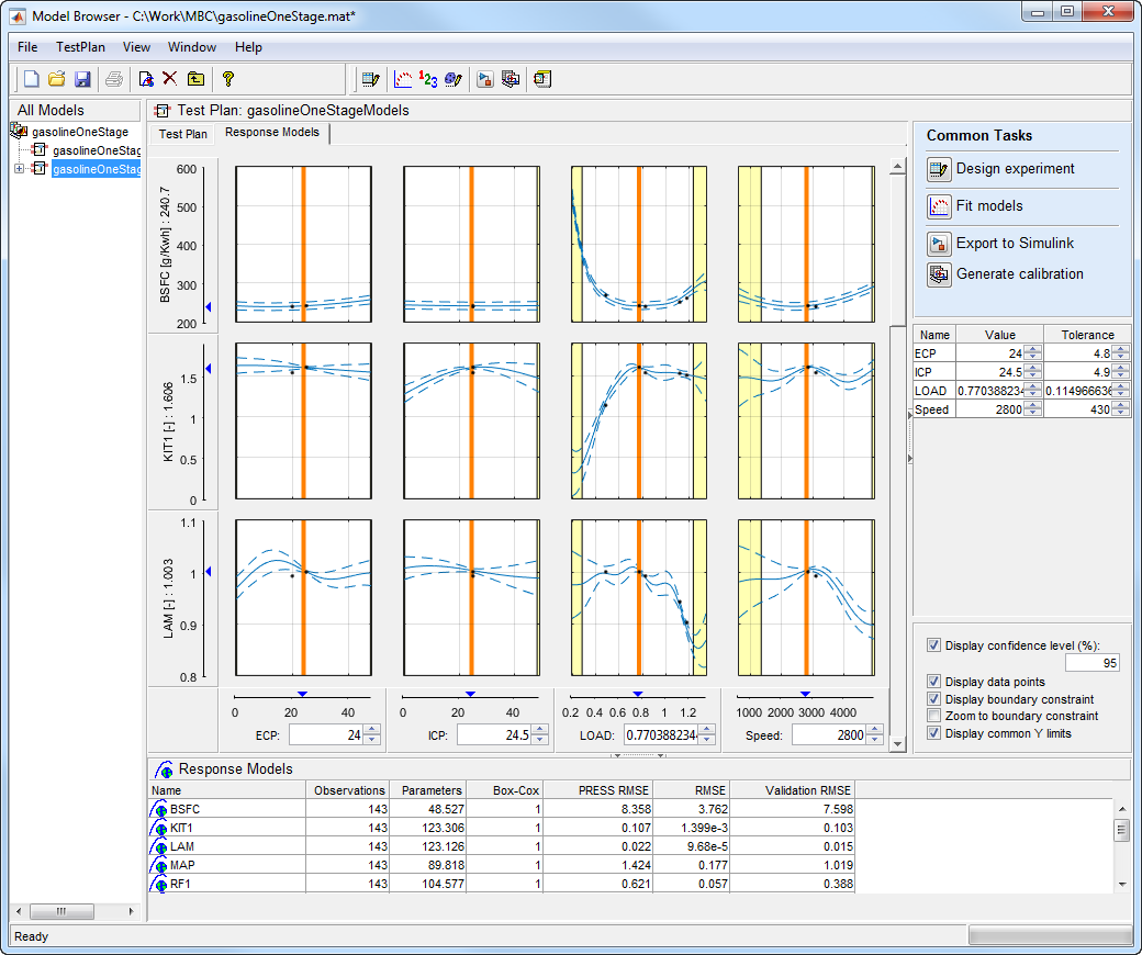 Приложение MBC Model Fitting позволяет вам создать экспериментальные планы, подходящие статистические модели к данным о механизме, и экспортировать модели, чтобы сгенерировать оптимальные калибровки в приложении MBC Optimization. Можно также экспортировать модели в MATLAB® и Simulink®, чтобы снова использовать статистические модели для системы управления, HIL-тестирования или симуляции трансмиссии.