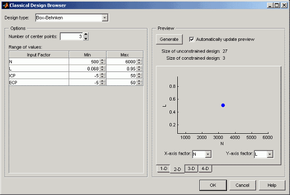 ) между угловыми точками и точками поверхности для каждого фактора и количества центральных точек, чтобы добавить. Используются пять уровней для каждого фактора. Можно установить области значений для каждого фактора. Inscribe star points масштабирует все точки в закодированных значениях 1 и-1 (вместо плюс или минус