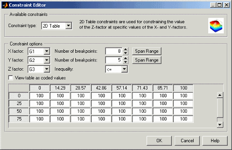 2D табличные ограничения являются расширением 1D таблица. Значения границы ограничений для фактора заданы по 2D сетке двух других факторов.