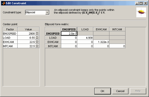 В этом примере, входя 2.5e-7 в диагонали ENGSPEED ограничивает ту ось 1/sqrt (2.5e-7) = 2000. Ввод нуля в диагонали INTCAM оставляет INTCAM неограниченный (то есть, ограничение является цилиндрическим расширением к концам факторной области значений INTCAM). Эллипс не вращается, когда недиагональные матричные записи являются всем нулем.