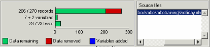 Поле списка в правом верхнем содержит информацию об исходном файле для данных, и другая информация отображена слева. Вкладка Summary перечисляет количества записей, переменных и тестов. Панели и фигуры показывают пропорцию записей, удаленных любыми фильтрами, примененными, и количество пользовательских переменных показывают. Для этого примера с двумя пользовательскими переменными, добавленными к набору данных, первоначально содержащему семь переменных, вы видите '7 + 2 variables.'