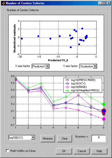 StepItRols чувствительно к установке Number of centers to add before updating. Включите опцию Display, чтобы просмотреть, как log10 (GCV) уменьшает, когда количество центров растет.