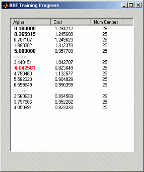 В TrialWidths, для каждого типа RBF попытайтесь сузить начальную область значений ширин, чтобы искать. Эта сила позволяет количеству изменений масштаба уменьшаться.