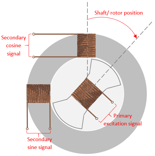 Этот пример управляет датчиком преобразователя, чтобы измерить положение ротора. Преобразователь состоит из двух ортогонально помещенных обмоток статора, помещенных вокруг обмотки ротора преобразователя. После того, как вы смонтируете датчик преобразователя по PMSM, обмотка ротора преобразователя вращается наряду с валом рабочего двигателя. Контроллер предоставляет фиксированной частоте переменный сигнал возбуждения обмотке ротора преобразователя. Когда ротор преобразователя вращается, обмотки статора преобразователя производят выход (вторичный синус и косинус) сигналы, которые модулируются с синусом и косинусом угла вала или положения. После получения вторичных сигналов, выборок контроллера и нормирует их.