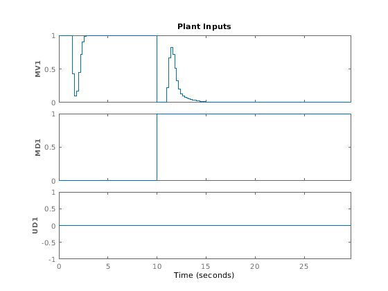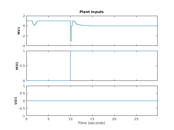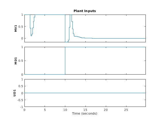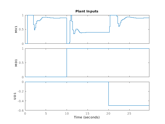 for t=0:round(Tstop/Ts)-1 % Store states XX = [XX,x]; %#ok<*AGROW> % Define measured disturbance signal v = 0; if t*Ts>=10 v = 1; end % Define unmeasured disturbance signal d = 0; if t*Ts>=20 d = -0.5; end % Plant equations: output update (no feedthrough from MV to Y) y = C*x + D(:,2)*v + D(:,3)*d; YY = [YY,y]; % Compute MPC action u = mpcmove(mpcobj,xmpc,y,r,v); % Plant equations: state update x = A*x + B(:,1)*u + B(:,2)*v + B(:,3)*d; UU = [UU,u]; end