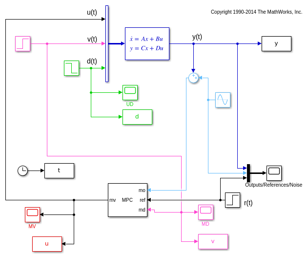 mpcobj = mpc(model,Ts,10,3); mpcobj.MV = struct('Min',0,'Max',1,'RateMin',-10,'RateMax',10); mpcobj.Model.Disturbance = tf(sqrt(1000),[1 0]);
