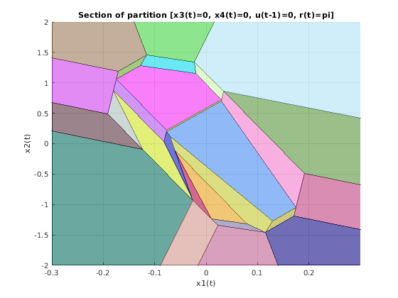 plotSection(mpcobjExplicit,params); axis([-.3 .3 -2 2]); grid title('Section of partition [x3(t)=0, x4(t)=0, u(t-1)=0, r(t)=pi]') xlabel('x1(t)') ylabel('x2(t)')