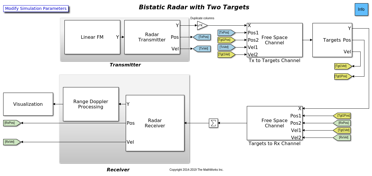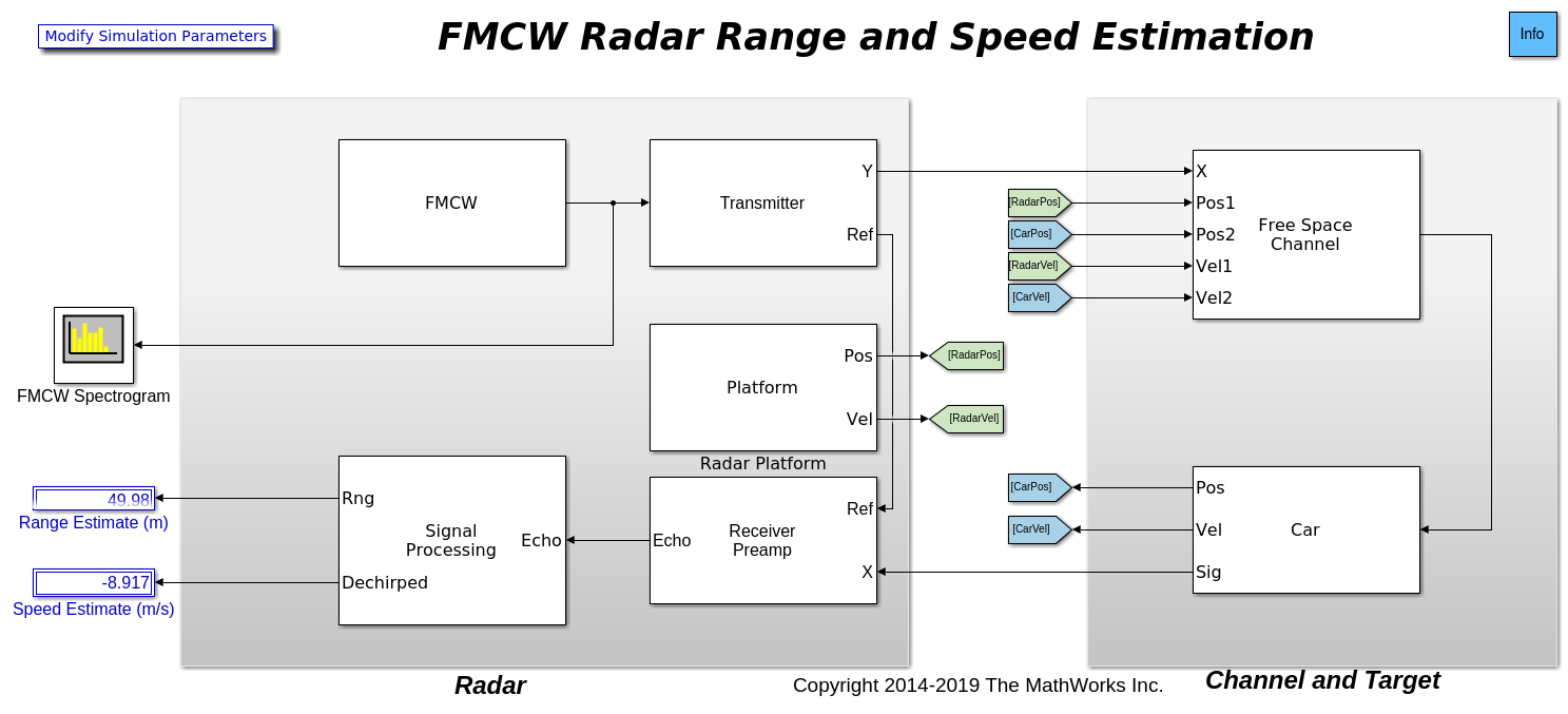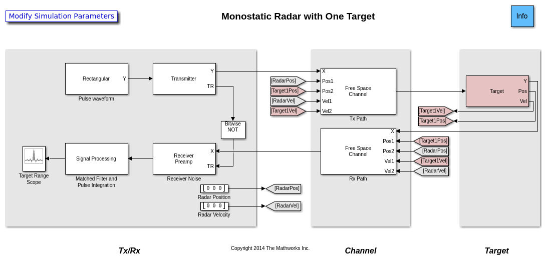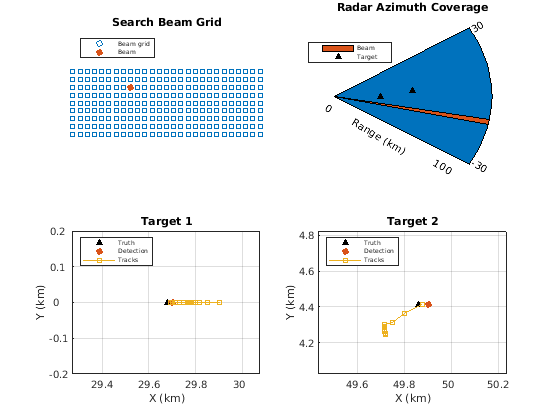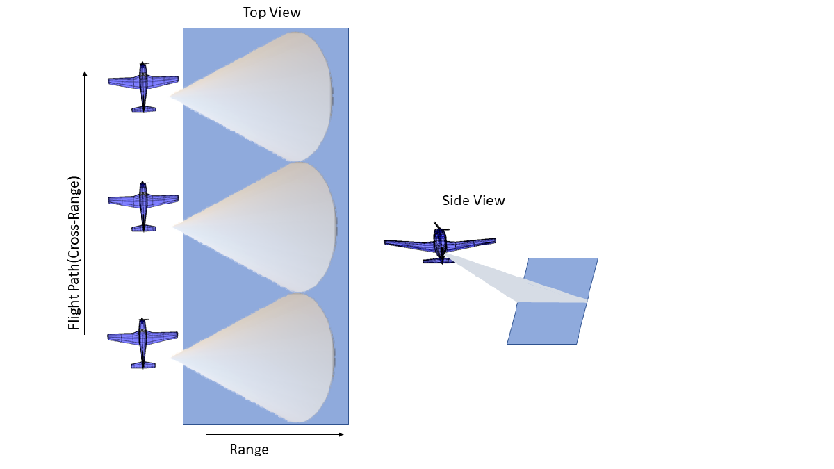 Смоделируйте находящуюся в stripmap систему Радара с синтезированной апертурой (SAR) с помощью Линейного FM (LFM) Форма волны. SAR является типом выглядящей словно стороны бортового радара, где достижимое разрешение перекрестной области значений намного выше по сравнению с действительным апертурным радаром. Изображение, сгенерированное с помощью SAR, имеет свои собственные преимущества, в основном, имеющие отношение к использованию активного датчика (радар) в противоположность обычным системам обработки изображений, использующим пассивный датчик (камера), которые используют окружающую подсветку, чтобы получить изображение. Поскольку активный датчик используется, система обеспечивает всепогодную производительность независимо от снега, вуали или дождя, например. Кроме того, конфигурируя систему, чтобы работать на различных частотах, таких как L-, S-или C-полоса может помочь анализировать различные слои на земле на основе различной глубины проникновения. Поскольку разрешение SAR зависит от сигнала и настройки антенны, разрешение может быть намного выше, чем для основанных на видении систем обработки изображений. Используя stripmap режим, этот пример выполняет и алгоритм миграции области значений [1] и аппроксимированную форму алгоритма задней проекции [2], чтобы отобразить стационарные цели. Аппроксимированная форма алгоритма задней проекции была выбрана для уменьшаемой вычислительной сложности, как обозначено в [3]. Линейная форма волны FM предлагает преимущество большого продукта пропускной способности времени в значительно более низкой степени передачи, делающей его подходящий для использования в бортовых системах.