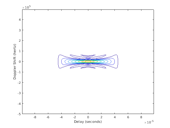 ambgfun(___), без выходных аргументов, строит функция crossambiguity или неоднозначность. Когда 'Cut' '2D', функция производит контурный график периодической функции неоднозначности. Когда 'Cut' 'Delay' или 'Doppler', функция производит линейный график периодического сокращения функции неоднозначности.