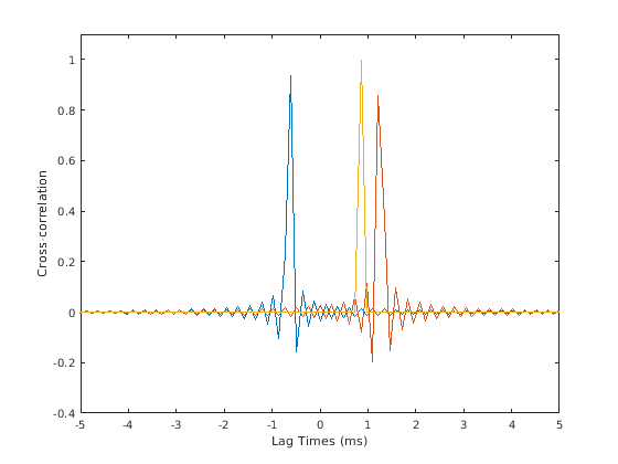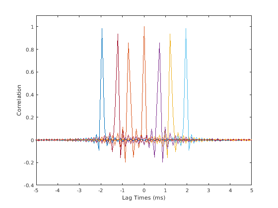 [tau,R,lag] = gccphat(___) возвращает, кроме того, значения взаимной корреляции и задержки корреляции, с помощью любого из аргументов от предыдущих синтаксисов. Задержки являются множителями интервала выборки. Количество каналов взаимной корреляции равняется количеству каналов в sig.