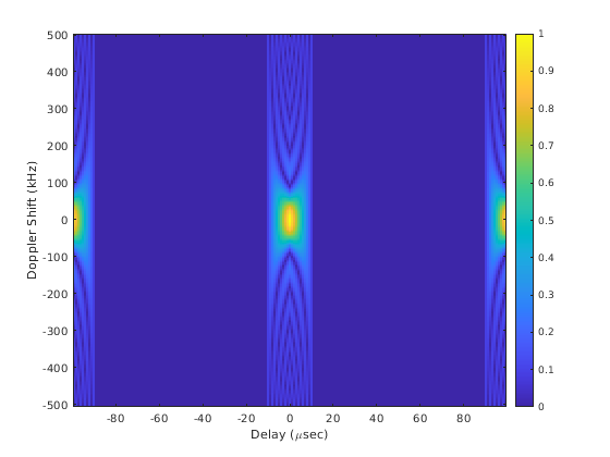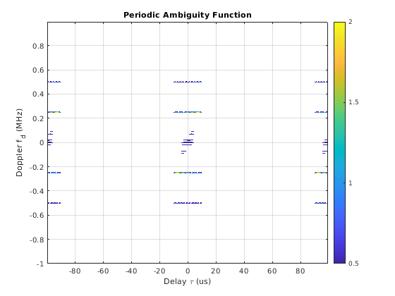 Постройте периодическую функцию неоднозначности формы волны меандра в течение одного периода. Примите, что импульсная частота повторения (PRF) составляет 10,0 кГц и что частота дискретизации является кратной PRF. Возвратите Доплера и значения задержки от pambgfun функция.