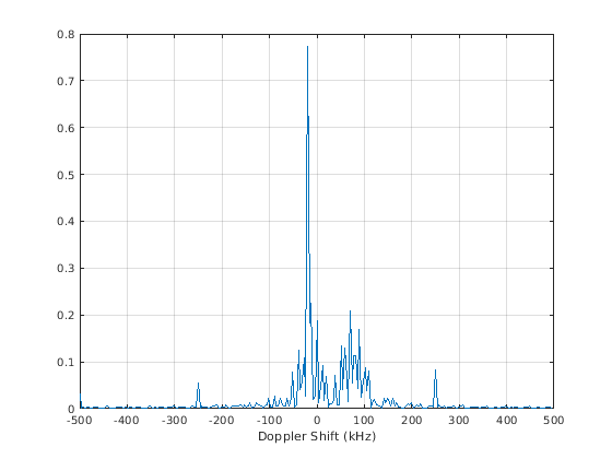 Вектор эффекта Доплера, возвращенный как M-by-1 вектор Доплеровских частот. Доплеровский вектор частоты состоит из M = 2ceil(log2 N) равномерно распределенные выборки. Частотами является (–(M/2)Fs,...,(M/2–1)Fs).