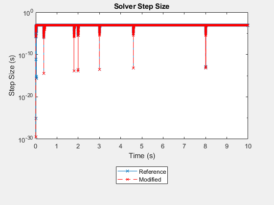 figure(h1) hold on semilogy(tSim0(1:end-1),diff(tSim0),'--x', 'Color','r',... 'LineWidth',.1,'MarkerSize',5) title('Solver Step Size') xlabel('Time (s)') ylabel('Step Size (s)') h1Legend1 = legend({'Reference','Modified'},... 'Location','southoutside');