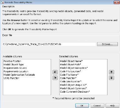 Когда вы используете Модельно-ориентированное проектирование и генерацию производственного кода, чтобы разработать компоненты прикладного программного обеспечения, можно сгенерировать traceability matrix. Матрица трассируемости обеспечивает трассируемость между объектами модели, сгенерированным кодом и требованиями модели. Можно добавить комментарии в сгенерированную матрицу трассируемости. Если вы изменяете модель и регенерируете матрицу трассируемости, матрица сохраняет ваши комментарии.
