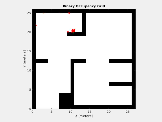 mapMatrix = office_area_map.occupancyMatrix > 0.5; mapScale = 10; initX = 20; initY = 30; initTheta = 0; fig = figure("Name","office_area_map"); set(fig, "Visible", "on"); ax = axes(fig); show(binaryOccupancyMap(mapMatrix, mapScale),"Parent",ax); hold on plotTransforms([initX, initY, 0], eul2quat([initTheta, 0, 0]), "MeshFilePath","groundvehicle.stl", "View", "2D"); light; hold off