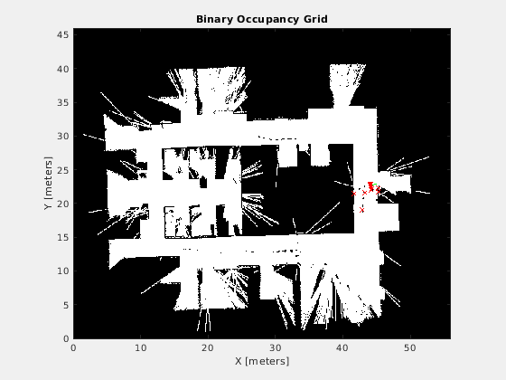 for i = 1:5:size(out.range, 3) u = out.pose(i, :); r = out.range(:, :, i); exampleHelperAvoidObstaclesPosePlot(u, mapMatrix, mapScale, r, scanAngles, ax); end