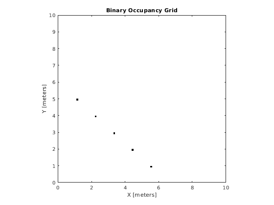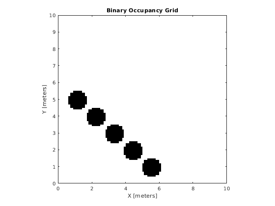 Сопоставьте представление в виде binaryOccupancyMap объект. Этот объект представляет среду робота. Объект содержит матричную сетку с двоичными значениями, указывающими на препятствия как true(1 ) и свободные местоположения как false(0 ).