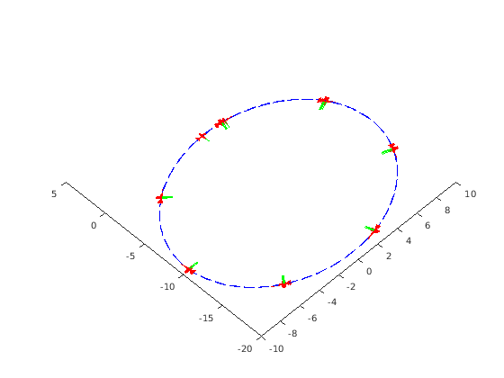 translations = simOut.y(1:3,1:300:end)'; % xyz position rotations = eul2quat(simOut.y(7:9,1:300:end)'); % ZYX Euler plotTransforms(translations,rotations,... 'MeshFilePath','multirotor.stl','InertialZDirection',"down") view([90.00 -0.60])