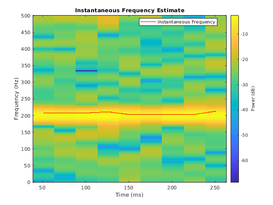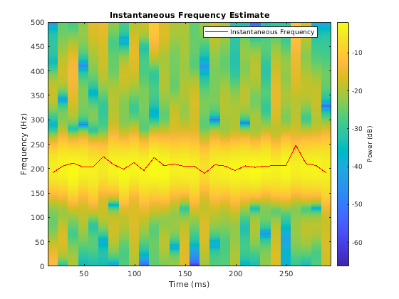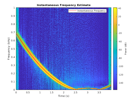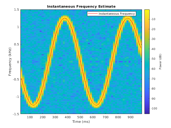 Используйте pspectrum функция с настройками по умолчанию, чтобы оценить спектр мощности сигнала. Используйте оценку, чтобы вычислить мгновенную частоту.
