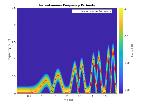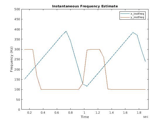 ifq = instfreq(x,fs) оценивает мгновенную частоту сигнала, x, произведенный на уровне fs. Если x матрица, затем функция оценивает мгновенную частоту независимо для каждого столбца и возвращает результат в соответствующий столбец ifq.