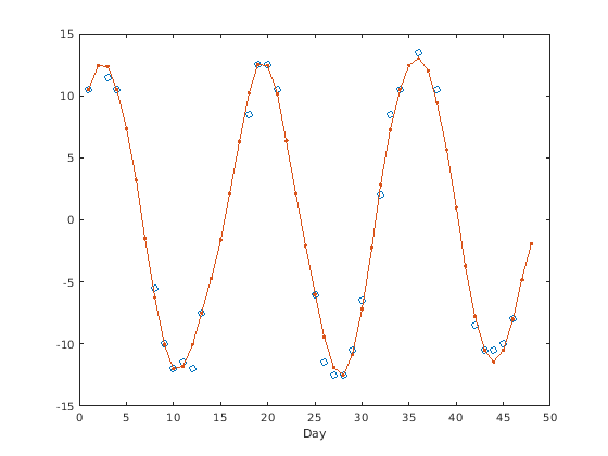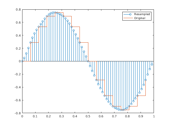 передискретизирует значения, y = resample(x,tx)x, из сигнала, произведенного в моменты, задан в векторном tx. Функция интерполирует x линейно на вектор однородно расположенных с интервалами моментов с теми же конечными точками и количеством выборок как txNaNs обработаны как недостающие данные и проигнорированы.