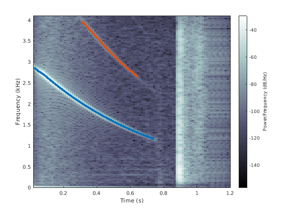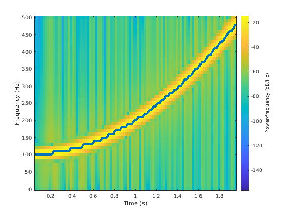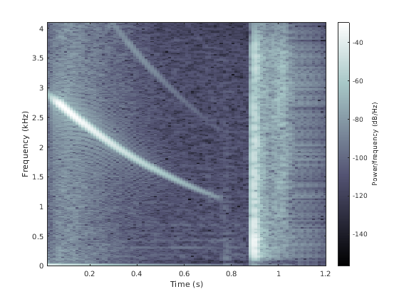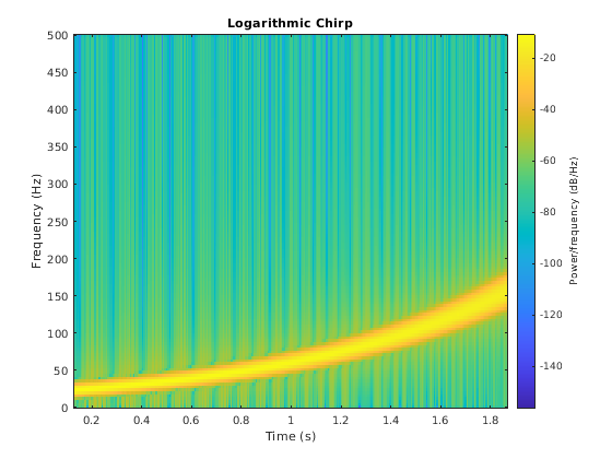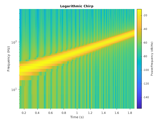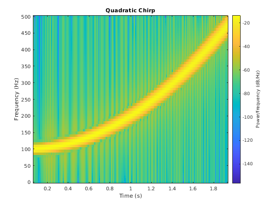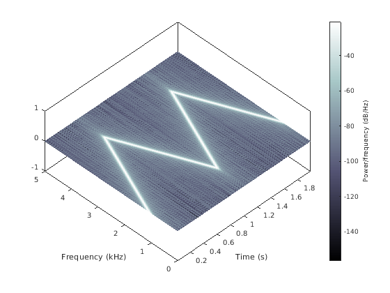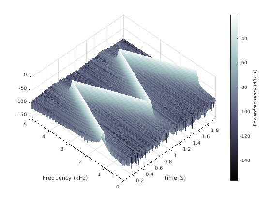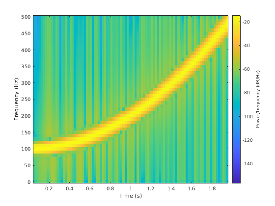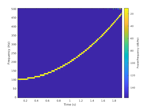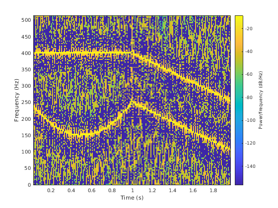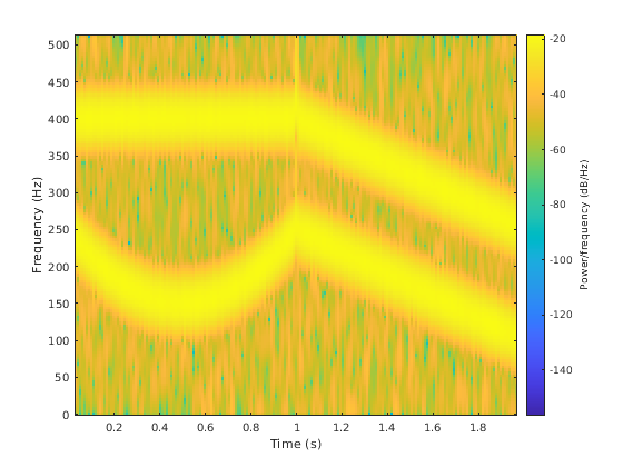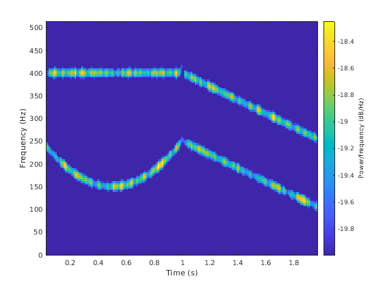 [___] = spectrogram(___,'reassigned') переприсвоения каждый PSD или спектр мощности оценивают к местоположению его центра энергии. Если ваш сигнал содержит хорошо локализованные временные или спектральные компоненты, то эта опция генерирует более резкую спектрограмму.