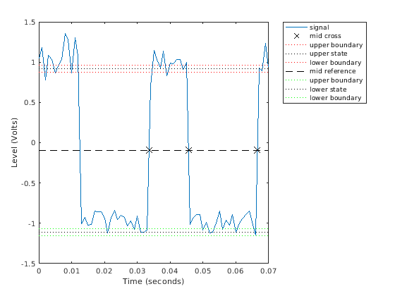 Сгенерируйте прямоугольную волну на 30 Гц, произведенную на уровне 1 кГц для 70 мс. Задайте рабочий цикл 37%. Добавьте белый Гауссов шум с отклонением 1/100.