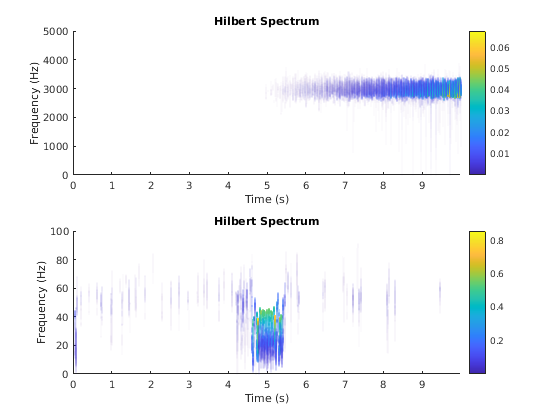 imf = emd(y,'MaxNumIMF',5,'Display',0); subplot(2,1,1) hht(imf(:,1),fs) subplot(2,1,2) hht(imf(:,3),fs,'FrequencyLimits',[0 100])