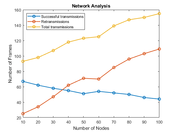 Вышеупомянутая модель показывает сеть 10 узлов. Можно создать сеть с большим количеством узлов с помощью функции помощника MATLAB hCreateWLANNetworkModel. Эта функция помощника использует подсистему узла из этого примера и создает сеть узлов WLAN, расположенных линейно 10 метров друг кроме друга. Можно создать различные сценарии симуляции и анализировать статистику уровня узла или сетевого уровня с различным количеством узлов. Например, график ниже показов повторные передачи и успешные передачи относительно общих передач, как количество узлов в сетевом увеличении. Параметры конфигурации, используемые в сборе результатов: