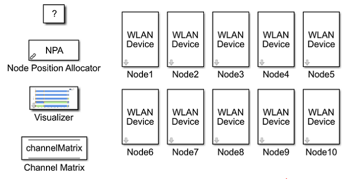 Положения для всех узлов в сети сконфигурированы через средство выделения положения узла (NPA) блокируйтесь в модели. Состояние каждого узла может визуализироваться во время времени выполнения через настройку, доступную в Visualizer блок. Channel Matrix блок является Памятью Хранилища данных. На инициализации реализация канала TGax сгенерирована между каждой парой узлов в сети, и получившаяся матрица канала на поднесущую хранится в блоке. Во время симуляции каждый узел получателя получает доступ к памяти, чтобы получить матрицу канала между собой и узлом передачи, чтобы определить качество ссылки. В этой модели, узлы 1, 2, 3, 6, 7, и 8 действий и как передатчики и как получатели, в то время как узлы 4, 5, 9, и 10 являются только пассивными получателями.
