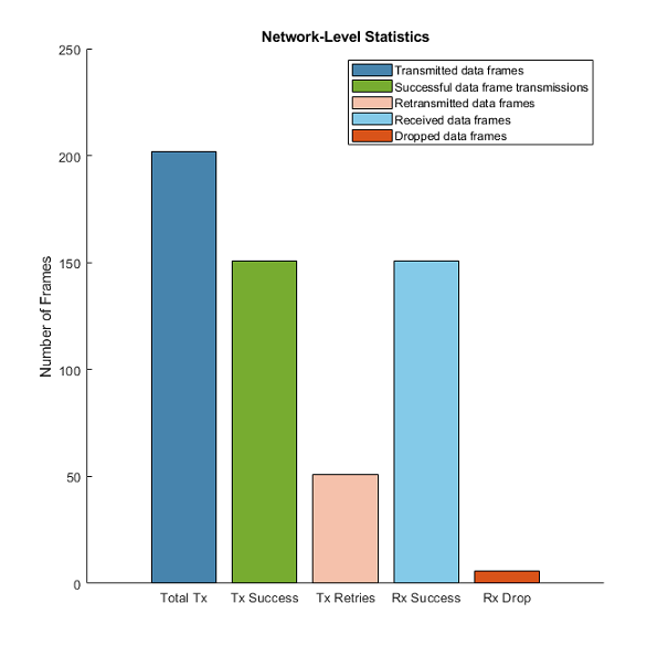 Выполнение модели симулирует сеть WLAN для заданного времени симуляции. График со статистикой сетевого уровня (соответствующий слою MAC) сгенерирован в конце симуляции. Подробные статистические данные уровня узла (соответствующий приложению, MAC и физическим уровням) собраны во время симуляции и сохраненные в файл базового рабочего пространства statistics.mat. Можно также включить дополнительную живую визуализацию, чтобы видеть состояние каждого узла во время времени выполнения, через настройку маски Visualizer блок.
