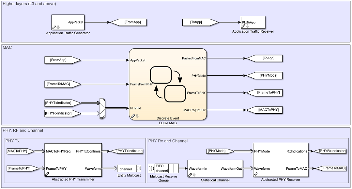 Каждый узел в вышеупомянутой модели является подсистемой, представляющей устройство WLAN. Каждый узел содержит прикладной уровень, слой MAC и физический уровень. Физический уровень моделируется с помощью абстрактных блоков PHY, описанных в предыдущем разделе. Можно сконфигурировать узел, чтобы передать и получить пакеты на определенном канале (частота) путем изменения Multicast tag параметр Entity Multicast и Multicast Receive Queue блоки. По умолчанию все узлы работают с тем же каналом. Можно также сконфигурировать получить область значений для определенного узла с помощью Packet Receive Range параметр Statistical Channel блок.