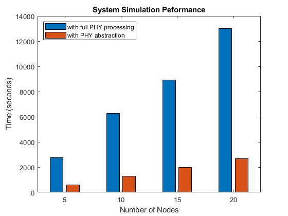 График ниже показов, которые симуляция запускает быстрее с абстрактным PHY по сравнению с полной обработкой PHY, таким образом делая его более масштабируемым. Параметры конфигурации, используемые в сборе результатов производительности: