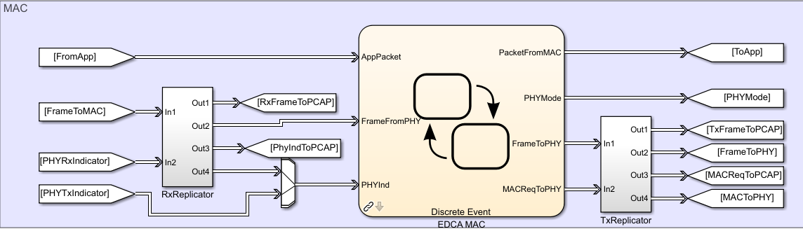 В слое MAC, RxReplicator блок копирует полученный A-MPDUs, FrameToMAC, и PhyRxIndicator вектор. TxReplicator блок копирует переданный A-MPDUs, FrameToPhy, и MACReqToPhy вектор. MAC обеспечивает RxFrameToPCAP, PhyIndToPCAP, TxFrameToPCAP, и MACReqToPCAP как вводит к pcapDump Блок DES.