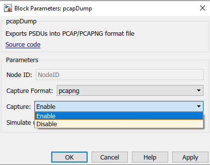 В этом примере А-МПДУ, которыми обмениваются между узлами, являются deaggregated к MPDUs в узле получения. Эти MPDUs экспортируются в пакетное получение (PCAP), и пакет получают следующее поколение (PCAPNG) файл формата с помощью pcapDump Блок DES. Использовать pcapDump Блок DES, перейдите к wlanSystemLevelComponentsLib