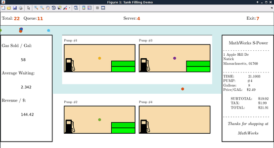 В разделе Service time action введите код MATLAB, чтобы варьироваться время обслуживания. Присвойте переменную dt, которую модель использует в качестве времени обслуживания.