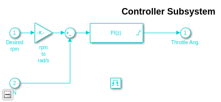 В этой модели мы нанимаем контроллер дискретного времени, который подходит для реализации микропроцессора. Интегральный термин в уравнении 1 должен таким образом быть понят приближением дискретного времени. Как типично в промышленности, выполнение контроллера синхронизируется с вращением коленчатого вала механизма. Контроллер встраивается в инициированную подсистему, которая инициирована сигналом синхронизации клапана, описанным выше.