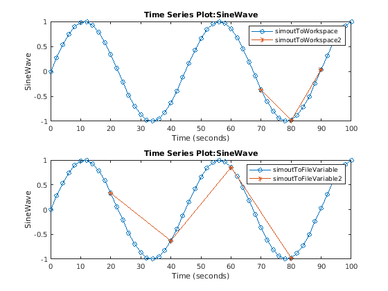 Для решателей переменного шага, чтобы управлять объемом данных, доступным для блока To File, используют Configuration Parameters> Data Import/Export> Additional parameters> параметр Output options. Например, чтобы записать данные в идентичных моментах времени по нескольким симуляциям, выберите Produce specified output only опция.