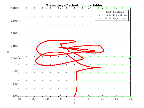 Stable = false(nA,nV); for ct = 1:nA*nV Stable(ct ) = isstable(G(:,:,ct)); end alpha_trajectory = Alpha_V_Data.signals(1).values(:,1); V_trajectory = Alpha_V_Data.signals(2).values(:,1); plot(alpha(Stable)*180/pi,V(Stable),'g.',... alpha(~Stable)*180/pi,V(~Stable),'k.',... alpha_trajectory,V_trajectory,'r.') title('Trajectory of scheduling variables') xlabel('\alpha'); ylabel('V') legend('Stable locations','Unstable locations','Actual trajectory')