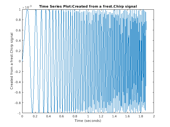 Используйте frest.Chirp объект представлять входной сигнал частотно-модулированного косинуса для оценки частотной характеристики. Входной сигнал частотно-модулированного косинуса или сигнал щебета, волнует вашу систему областью значений частот, таких, что входная частота изменяется мгновенно.