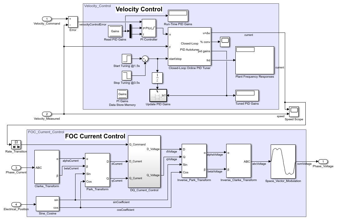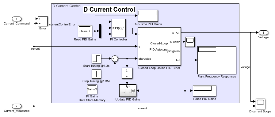 Вставьте блок Closed-Loop PID Autotuner между блоком PID и объектом для всех трех ПИ-контроллеров, как показано в модели FOC PMSM. start/stop сигнал запускает и останавливает эксперимент с обратной связью. Когда никакой эксперимент не запускается, блок Closed-Loop PID Autotuner ведет себя как блок усиления единицы, куда
