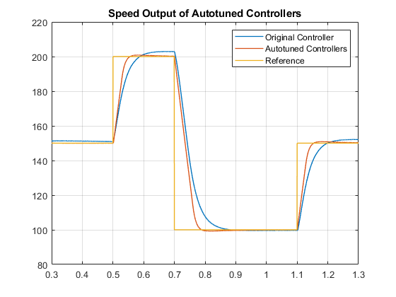 Те же скоростные команды применяются до и после процесса автоматической настройки. График ответы скорости до и после контроллеров настраивается с помощью блока Closed-Loop PID Autotuner. Кривые отклика скорости выравниваются вовремя, чтобы сравнить производительность контроллера рядом друг с другом.