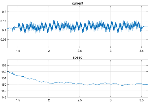 Следующий рисунок показывает текущие ответы и ответы скорости во время настройки, от 1,3 до 3,5 секунд. Изменение в токе в 0.1 A и изменение в частоте вращения двигателя в 2 рад/секунда (о 1% отклонение).